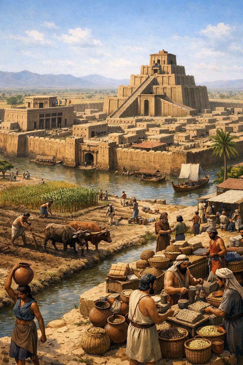 Det store skiftet inntraff med den urbane revolusjonen i Mesopotamia for over 5000 år siden (Childe 1983). Da byene vokste til en kritisk masse, skjedde et sosiologisk faseskift hvor ansvar ble anonymisert. Tusenvis av mennesker bodde nå sammen og kjente ikke lenger de som forvaltet fellesskapets ressurser. Administratoren (oftest en prest) av kornsiloen var ikke lenger en nabo, men innehaver av en rolle. I de første protostatene ble denne rollen besatt av utskiftbare mennesker som handlet på vegne av en guddom. Fra å være et menneske alle kjente, ble administratoren av kornsiloen en abstrakt og potensielt evigvarende rolle. Språket tillot menneskene å skape en fiksjon – en rolle – som eksisterte uavhengig av personen som innehadde den.